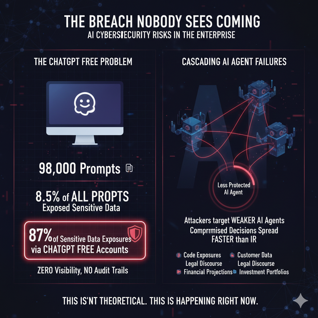 But here's the part that tells you everything about where we are: analysis from Harmonic Security found that 87% of sensitive data exposures occurred via ChatGPT Free accounts where organizations have zero visibility, no audit trails, and data may train public models.